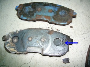 前回の作業のときにフロントのパッドを昔使ってたものに交換しました。 作業のついでに古いパッドをとってみると・・・ほとんど土台しか残ってない。(+_+)わずかに残った部分も端っこを手でつっつくとポロポロと崩れる始末。 これはキャリパー流用までもたないと判断し、中古パッドのがマシということで交換しました。 で、今回使い終わったパッド(画像下)と中古パッド(画像上)を比べてみると、背中の部分に2つあるぽっち(矢印の部分)が今回のパッドはくぼんでる。中古パッドは2つぽっちはあるけどほぼ面と同じになっています。 ちなみに、銘柄は同じ。エンドレスのSSSです。 今まで存在は知ってたけど、気にしたことありませんでした。このぽっちって何だろ?(?_?) よくわからんけど、最近壊れることなく走れてるから、パッドがかなり熱を持つようになってこうなったのかなー。。。熱膨張によるパッドの歪みを吸収する部分とか。 実際今回のパッドは中古パッドに比べて黒く変色してるし。 また調べてみます。 | ![]() |
